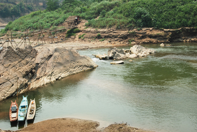 Przez Nam Khan najłatwiej przejechać jednym z kilku drewnianych mostów, które bezwględnie będą pierwszym fotogenicznym krajobrazem, jaki warto uwiecznić swoim aparatem. Trzeba jedynie pamiętąć, że kobiety siedzące w małych drewnianych chatkach na początku mostu, będą żądać zapłaty za przejazd dając w zamian bilet powrotny gratis (ale tylko na ten most, który przekraczamy). Opłata jest raczej symboliczna i niewykluczone, że przynajmniej w jakiejś części przeznaczona na renowację, która na pewno coś jakiś czas jest potrzebna. Jeśli już jesteśmy po drugiej stronie Nam Khan, warto swoją wycieczkę zaplanować w taki sposób, aby zachód słońca spędzić w drewnianej knajpie na urwisku tuż przy zbiegu obu rzek. Względnie ciekawy widok jest także ze świątyni pomiędzy dwoma mostami. Zarówno świątynię jak i knajpę łatwo namierzymy wzrokiem przechodząc przez którykolwiek z mostów. Wystarczy spojrzeć w lewo.