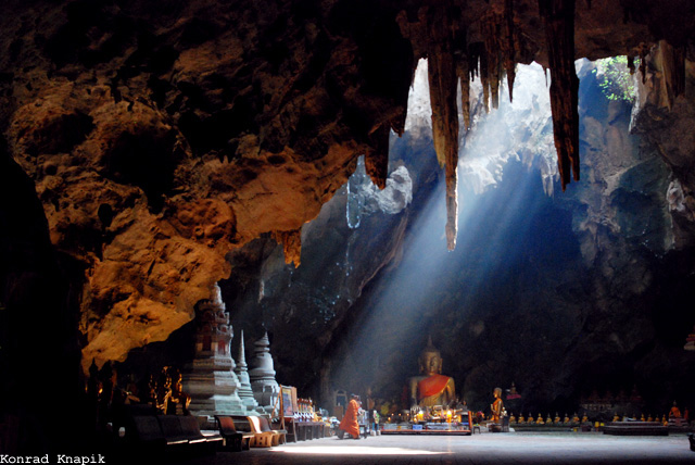 Kilka kilometrów dalej znajdują się dwie jaskinie – Khao Luang i Khao Bandai-It. Przyznać należy, że niewiele jest takich miejsc w Tajlandii, jak jaskinia Khao Luang. Ogromna, wypełnioną masą długich, zwisających stalaktytów, z niewielką w porównaniu do całości dziurą, przez którą przedostają się pojedyncze promyki słońca. Wszędzie ustawione są setki posągów Buddy. Niektóre z nich wysokie nawet na kilkanaście metrów. Największe wrażenie robi leżący Budda, zwłaszcza, jeśli spojrzymy na niego z wewnątrz drugiej, połączonej przejściem jaskini. Przed wejściem można spotkać ciekawskie i niezwykle psotne małpy, które są gotowe ukraść każdą pojedynczą rzecz. Trzeba się więc mieć na baczności.
